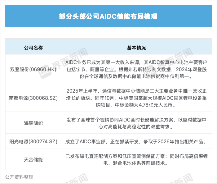 多家国内储能企业已崭露头角。2025年8月,双登股份(06960.HK)登陆港交所,被业内称为“AIDC储能第一股”。其AIDC智算中心电池主要客户包括字节、阿里等企业。