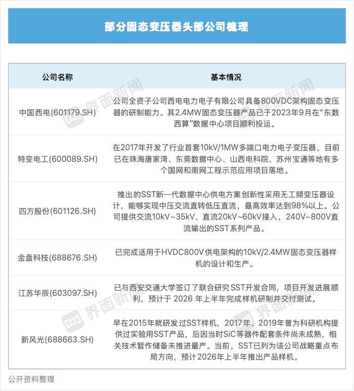 目前,国内多家企业已固态变压器方面取得实质性进展,包括中国西电(601179.SH)、特变电工(600089.SH)、四方股份(601126.SH)、四方股份(601126.SH)等。