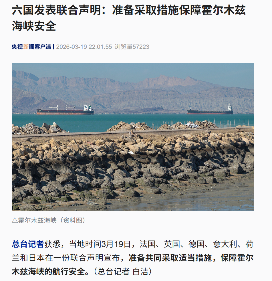 当地时间3月19日,法国、英国、德国、意大利、荷兰和日本在一份联合声明宣布,准备共同采取适当措施,保障霍尔木兹海峡的航行安全。