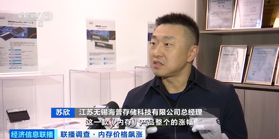 江苏无锡海普存储科技有限公司总经理 苏欣:这一款内存产品的涨幅从去年的四季度到现在,差不多有三到四倍。去年市场价可能是三四千元,现在甚至有1万元以上的价格出现,我感觉甚至比黄金还要贵了。