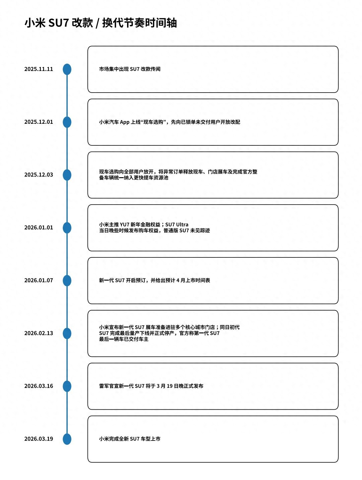 时间线上看,自2025年11月11日市场集中出现SU7改款传闻起,到2026年3月19日晚新一代SU7正式发布,小米为这次中改切换准备了128天。不同于传统车企更常见的切换方式,这家公司在4个月内并未将旧款清尾、新款预热和现车拆解成彼此割裂的动作,节奏清晰而连贯。