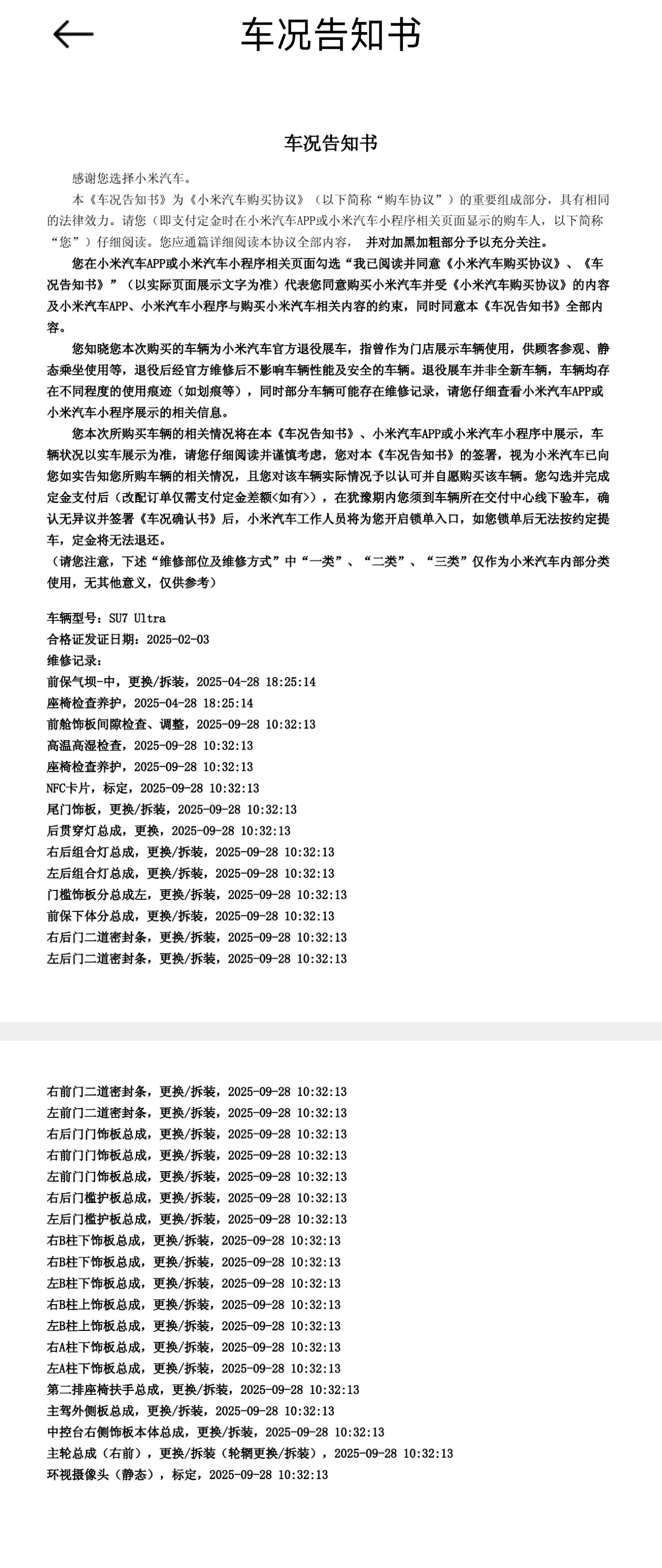 一份SU7 Ultra现车《车况告知书》截图里,维修记录甚至被逐项公示到饰板、灯组和密封条层级。这当然有助于营造“诚实”的信用标签,但也同时意味着,一旦热度回落或创始人背书减弱,该动作随时可能反过来成为舆论压力的入口。