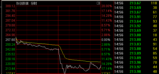协创数据(300857)午后大幅跳水,盘中一度触及跌停,收盘跌近15%,全日成交88.6亿元。