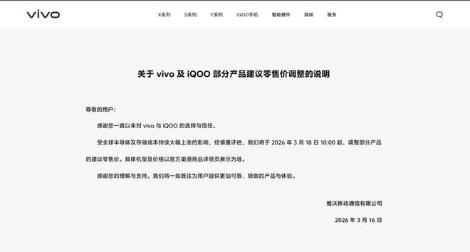 vivo官方则于3月16日官宣涨价。其官方社区发布公告称,受全球半导体及存储成本持续大幅上涨的影响,公司将于2026年3月18日10时起,调整部分产品的建议零售价。具体机型及价格以官方渠道商品详情页展示为准。与此同时,iQOO也宣布将同步进行相关价格调整。