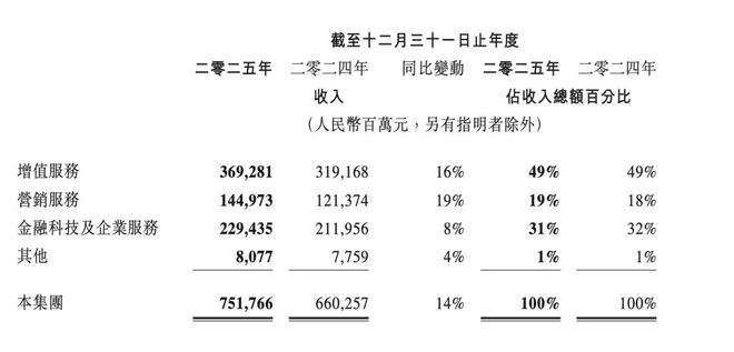 另外,营销服务收入同比增长19%至1449.73亿元;金融科技及企业服务收入同比增长8%至2294.35亿元。