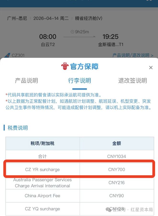 红星资本局查询发现,以南方航空为例,4月14日,该航司从广州飞往悉尼的一趟航班,总票价税费为1034元,而燃油附加费就占了700元。