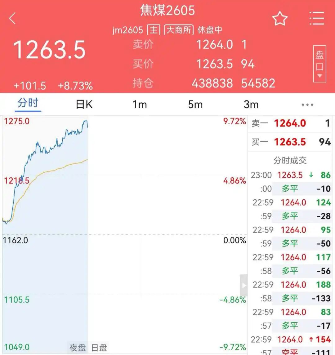 3月20日夜盘,焦煤期货主力2605合约开盘后直线拉升,大涨8.73%。