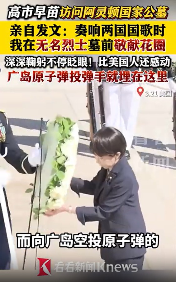 3月21日,正在访美的日本首相高市早苗发文称:“我参观了阿灵顿国家公墓,在奏响日本和美国国歌时,我在无名烈士墓前敬献了花圈。”画面中,献花后高市早苗手放胸口、深深鞠躬、不停眨眼,看起来比身边陪同的美国女兵还感动。