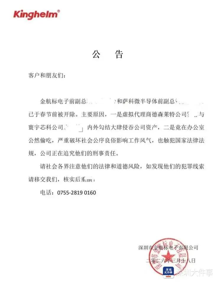近日,网传深圳市金航标电子有限公司发布一则公告,称金航标前副总及萨科微半导体前副总已被开除,主要原因一是虚拟代理商德森莱特公司与寰宇芯科公司,内外勾结大肆侵吞公司资产,二是竟在办公室公然偷吃,严重破坏社会公序良俗,影响工作风气,也触犯国家法律法规,公司正在追究他们的刑事责任。