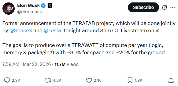 SpaceX与特斯拉在美东时间周六晚8点联合发布了Terafab项目,并在X平台上进行了直播。Terafab项目的目标是每年制造1000亿至2000亿颗先进的2纳米芯片。