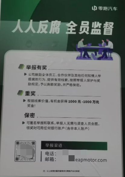 据了解,零跑对内也发布了反腐举报奖励,鼓励员工、合作伙伴和其他任何知情人举报腐败行为、提供有效线索。根据线索价值有机会奖励1000元至1000万元奖金。
