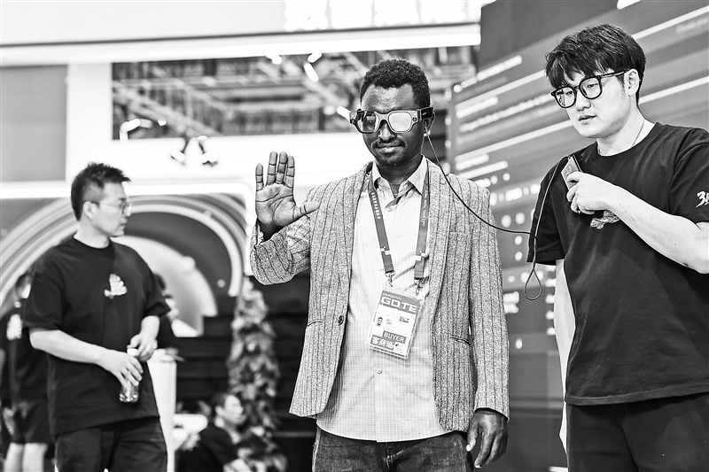 外籍客商(右二)在第四届全球数字贸易博览会人工智能展区体验智能眼镜设备。