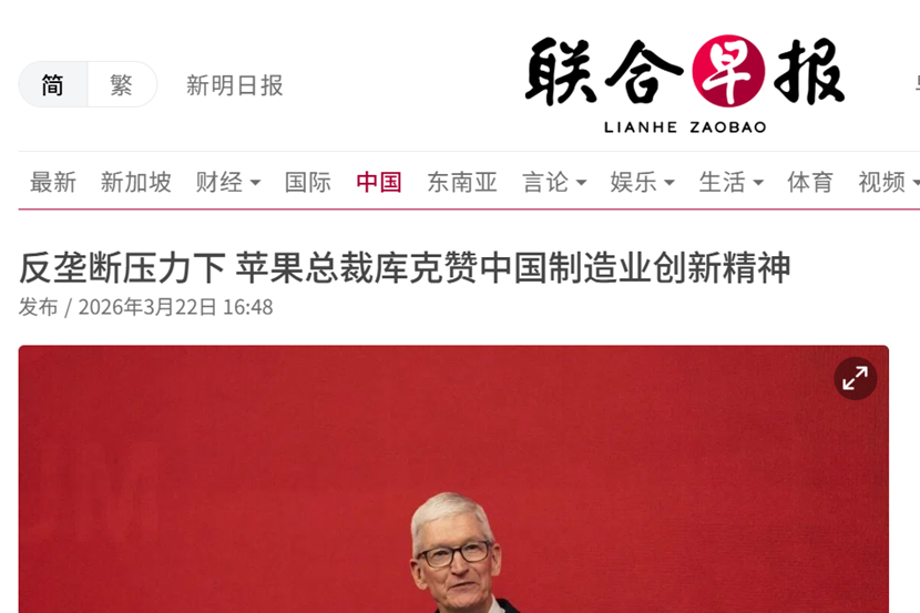 《联合早报》发文称,库克赞扬了中国科技开发者的创新能力,称他们每天都在突破创新的极限,中国开发者们利用技术打造各类工具让人备受鼓舞,这些工具帮助人们学习技能、管理健康,并将新想法变为现实。