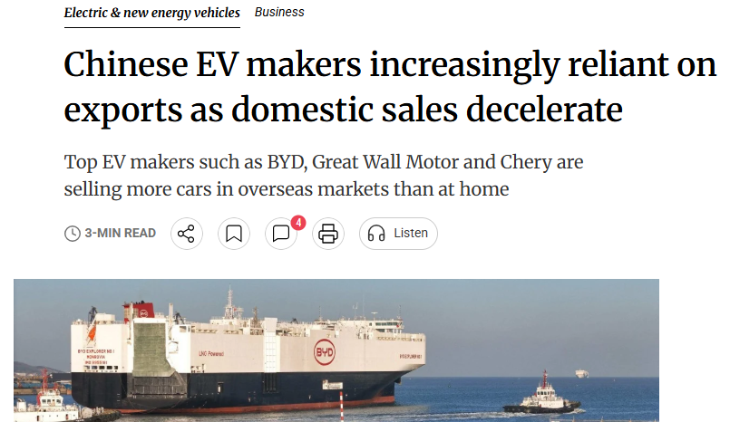 报道提到,总部位于上海的国际智能vehicle工程协会的秘书长张大卫表示:“在国内竞争加剧的情况下,中国电动车制造商正在将重点转向全球市场。”盈富证券国际策略师邓志坚表示,汽车出口量的上升可能会稍微缓解投资者对中国电动汽车制造商在国内激烈价格竞争导致的沉重压力。
