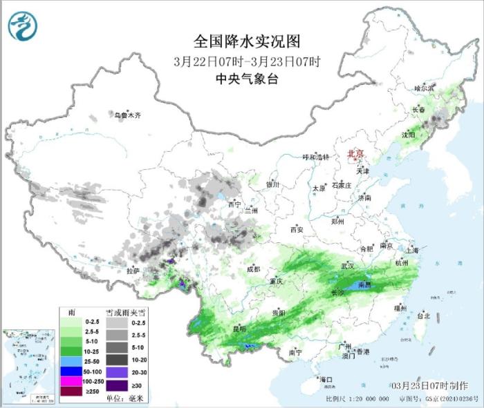 据中央气象台网站消息,昨日,青海北部、甘肃中部和南部、川西高原北部、西藏中东部、吉林东部等地出现小到中雪或雨夹雪,江西中部、湖南东北部、贵州南部、广西北部、云南西部和南部等地出现中到大雨,云南南部等局地暴雨。
