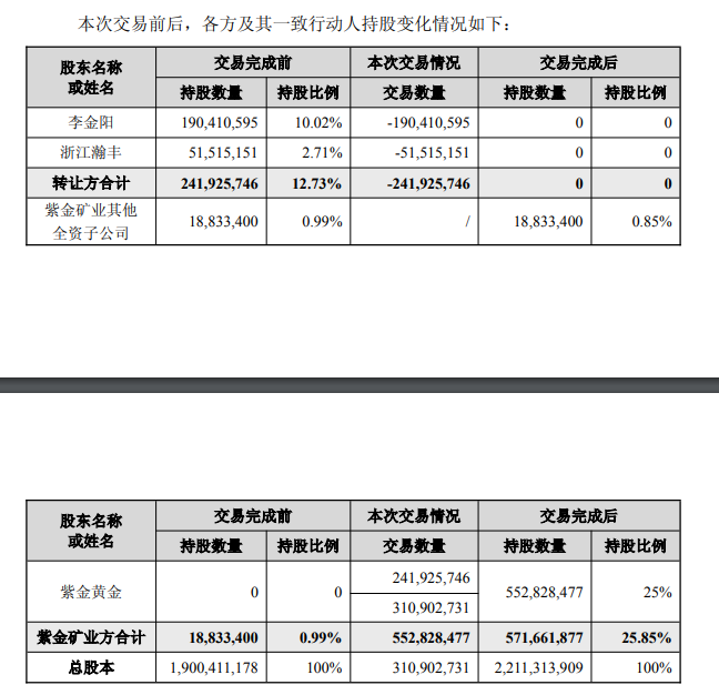 公告指出,待股份转让及战略投资均完成后,紫金集团将合计持有赤峰黄金约5.72亿股股份(含2.42亿股A股及3.30亿股H股),占公司经扩大已发行股本的约25.85%,届时紫金集团将成为赤峰黄金单一最大股东。