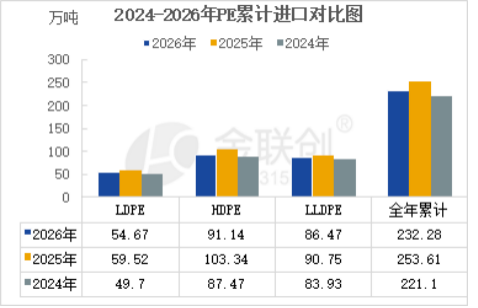 2026年1-2月份聚乙烯累计进口232.28万吨,较去年同期降21.33万吨,降幅8.41%,其中高压54.67万吨,较去年同期降4.85万吨,降幅8.15%,低压91.14万吨,较去年同期降12.2万吨,降幅11.81%,线性86.47万吨,较去年同期降4.28万吨,降幅4.72%。