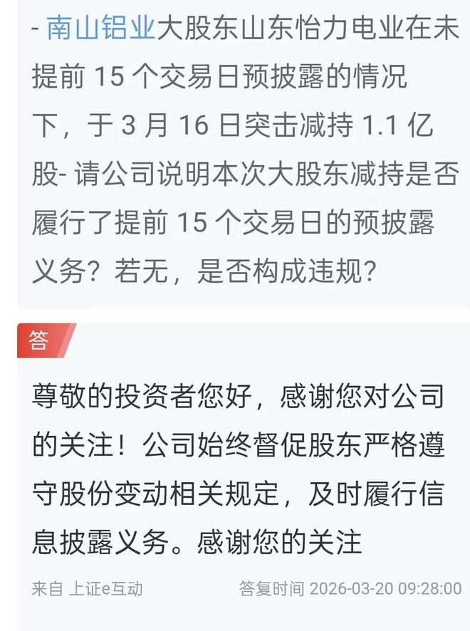 南山铝业在互动平台回复称,公司始终督促股东严格遵守股份变动相关规定,及时履行信息披露义务。