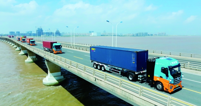 上汽集团旗下友道智途新能源重卡车队行驶在东海大桥上
