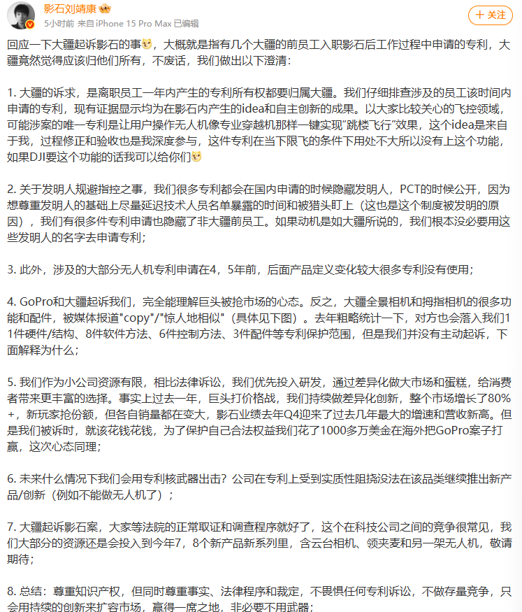 刘靖康表示,经公司仔细排查,涉案专利的创意和成果均在影石内部完成,其中飞控领域涉案专利的“跳楼飞行”创意,正是源于其本人,且全程深度参与研发修正。