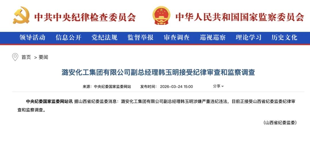 据山西省纪委监委消息:潞安化工集团有限公司副总经理韩玉明涉嫌严重违纪违法,目前正接受山西省纪委监委纪律审查和监察调查。