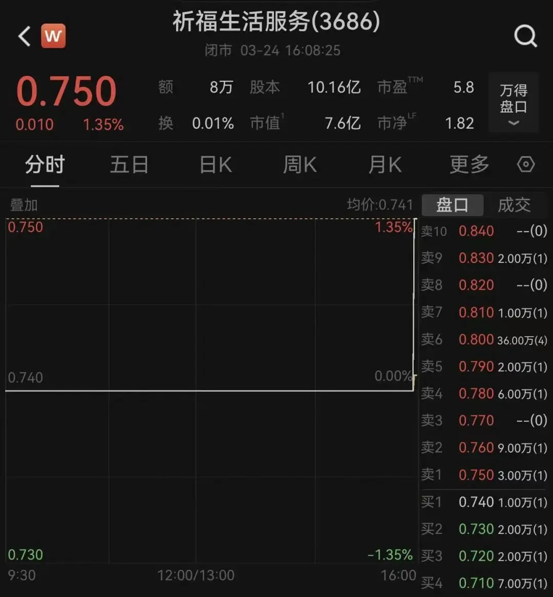 二级市场上,截至3月24日收盘,祈福生活服务尾盘直线拉升,报收0.75港元,最新市值为7.6亿港元。