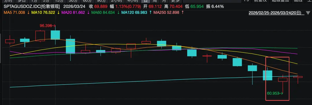 祈福生活服务公告当天(3月23日),现货黄金盘中跌超8%,一度失守4100美元/盎司;现货白银盘中一度跌逾10%,逼近60美元/盎司,金银盘中均创年内新低,抄底“值博率”较高。