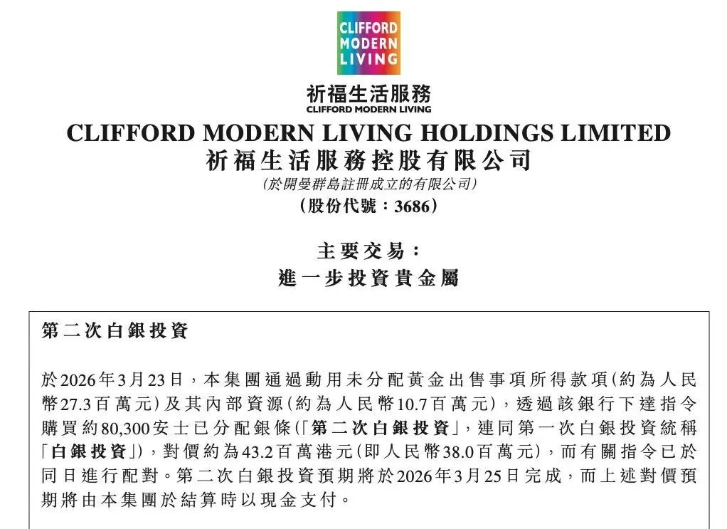 3月23日晚,祈福生活服务发布公告进行第二次白银投资,称公司斥资约4320万港元(约合人民币3800万元),购入约8.03万安士(约2.498吨)已分配银条,以未分配黄金出售所得约2730万元人民币及内部资源约1070万元人民币支付。此次投资预计将于3月25日完成。