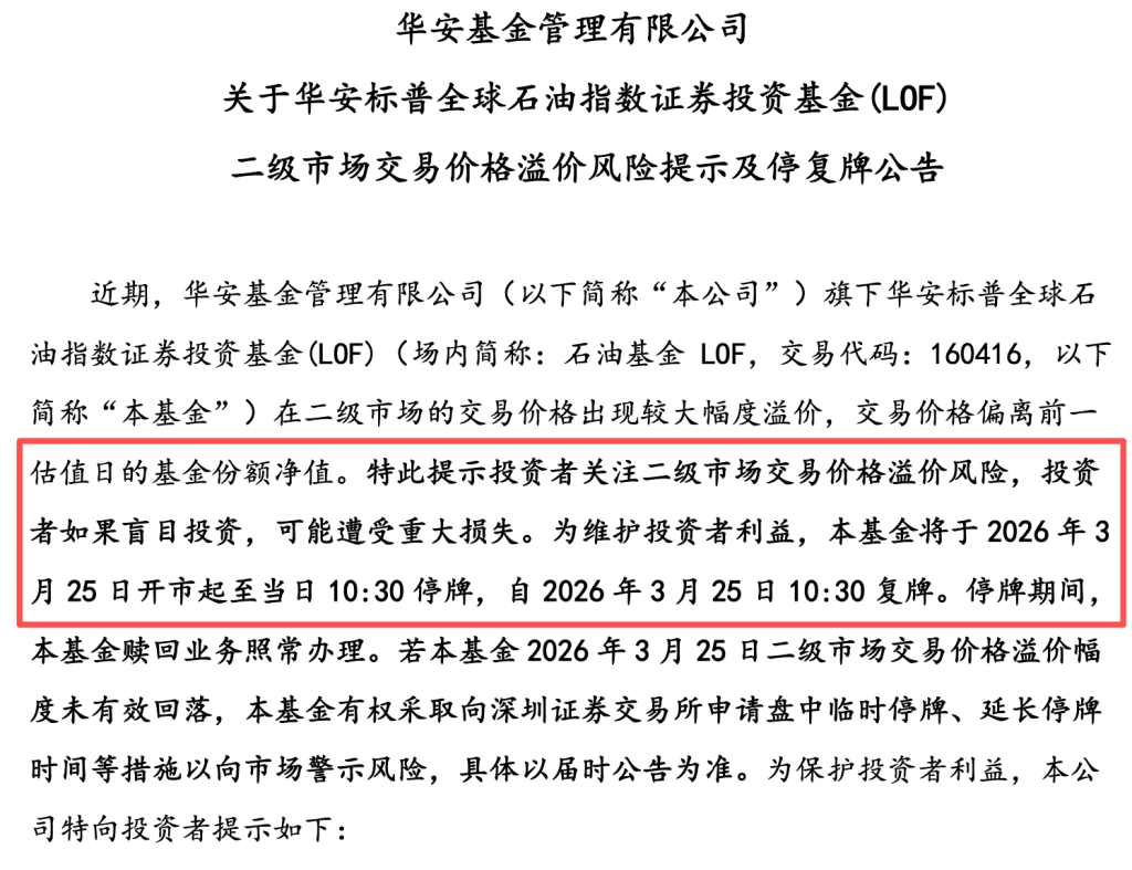 值得注意的是,交易所选择午间休市时段出手,将基金“摁下”停牌的案例并不多见。此前3月初,华安标普全球石油LOF、南方原油LOF同样因溢价“高烧”盘中紧急临停。