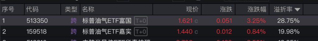 在ETF市场方面,溢价同样不容忽视。截至3月24日收盘,富国标普油气ETF溢价率达28.75%,居全市场首位;嘉实标普油气ETF溢价率亦达19.98%,紧随其后。