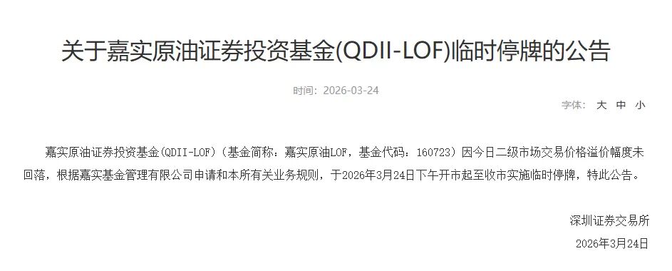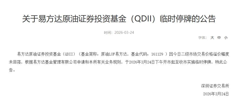 3月24日,深交所发布公告,因二级市场交易价格溢价幅度未回落,原油LOF易方达(161129)、嘉实原油LOF(160723)于当日下午开市起至收市实施临时停牌。