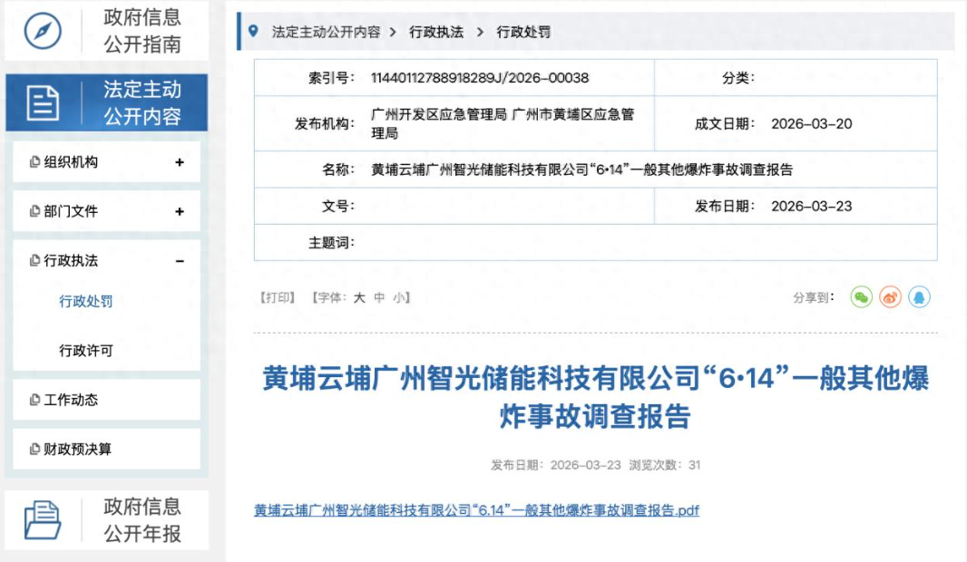 近日,广州市黄埔区应急管理局公布《黄埔云埔广州智光储能科技有限公司“6·14”一般其他爆炸事故调查报告》,通报涉及发生在2024年的一起电池闪爆致死事故。