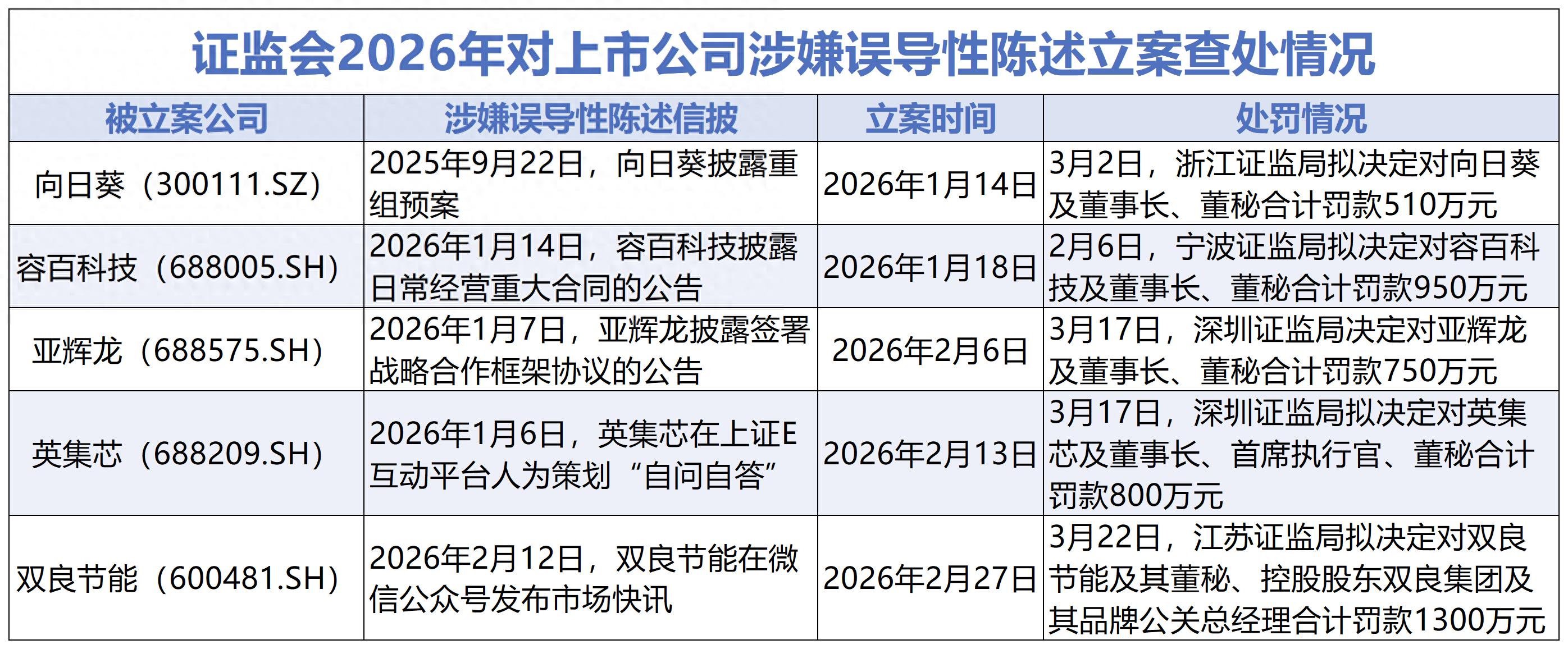 记者梳理发现,自2026年1月14日至2月27日,证监部门共对上市公司涉嫌误导性陈述立案5起。自2月6日至3月22日,对5起案件都已作出行政处罚决定或事先告知。