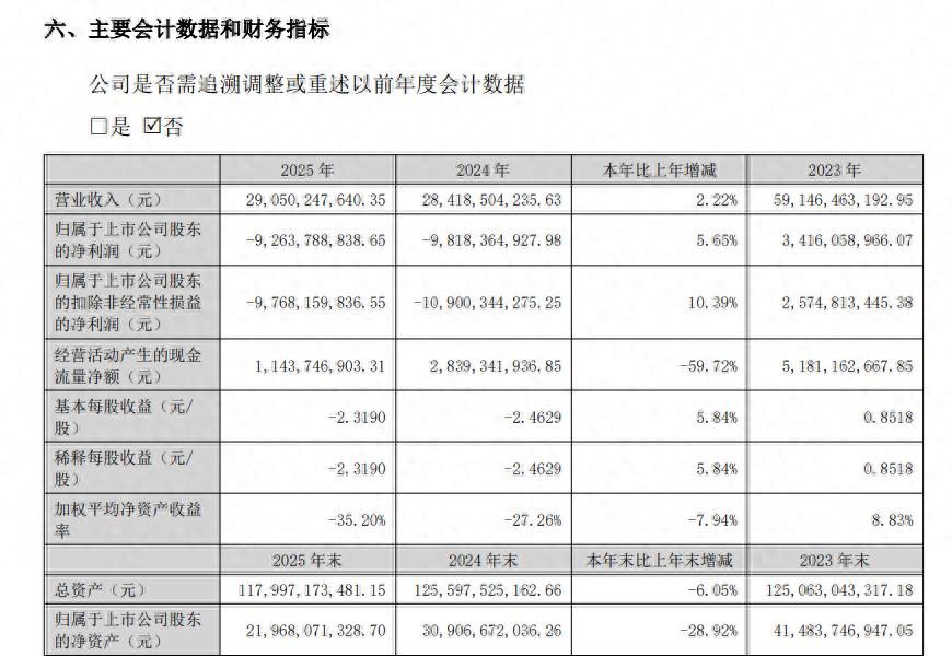 3月24日晚间,TCL中环发布了2025年年度报告。报告显示,公司2025年实现营业收入290.50亿元,同比微增2.22%;但归属于上市公司股东的净利润为-92.64亿元,虽较2024年的-98.18亿元减亏5.65%,亏损额依然触目惊心。