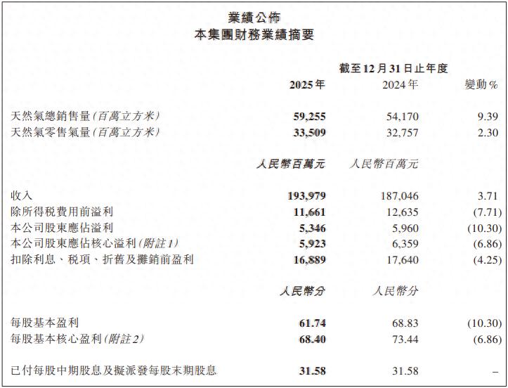 业务方面,全年天然气总销售量为592.55亿立方米,同比增长9.39%;其中天然气零售销量为335.09亿立方米,同比增长2.30%。公司已付每股中期股息及拟派发每股末期股息合计为31.58分。