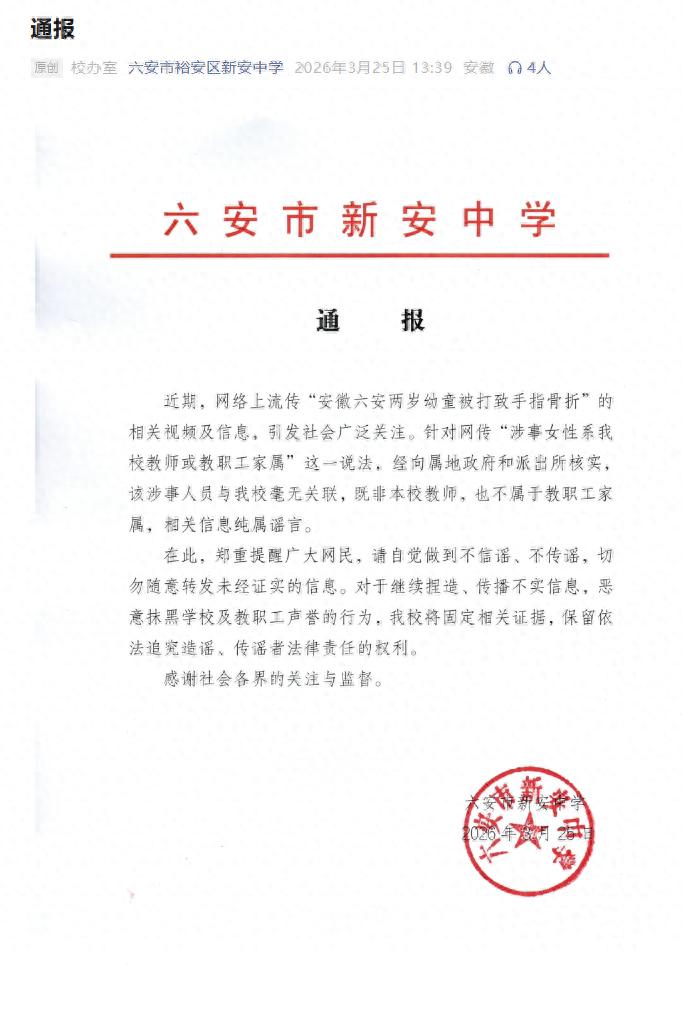 3月25日,安徽六安市裕安区新安中学通报:近期,网络上流传“安徽六安两岁幼童被打致手指骨折”的相关视频及信息,引发社会广泛关注。针对网传“涉事女性系我校教师或教职工家属”这一说法,经向属地政府和派出所核实,该涉事人员与我校毫无关联,既非本校教师,也不属于教职工家属,相关信息纯属谣言。