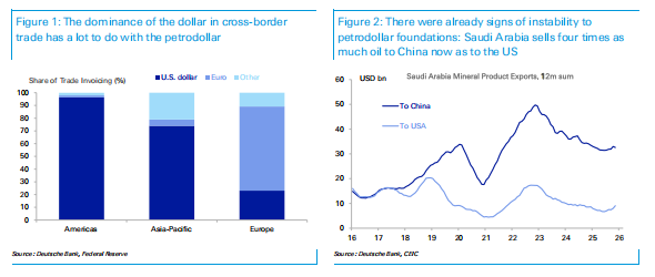 德银认为,本次冲突可能进一步暴露体系裂痕:美国对海湾地区基础设施的安全庇护、以及全球石油贸易的海上安全保障均受到挑战。海湾经济体遭受损失,可能促使其减持以美元为主的海外资产储蓄。这场冲突可能成为石油美元主导地位削弱的关键催化剂。