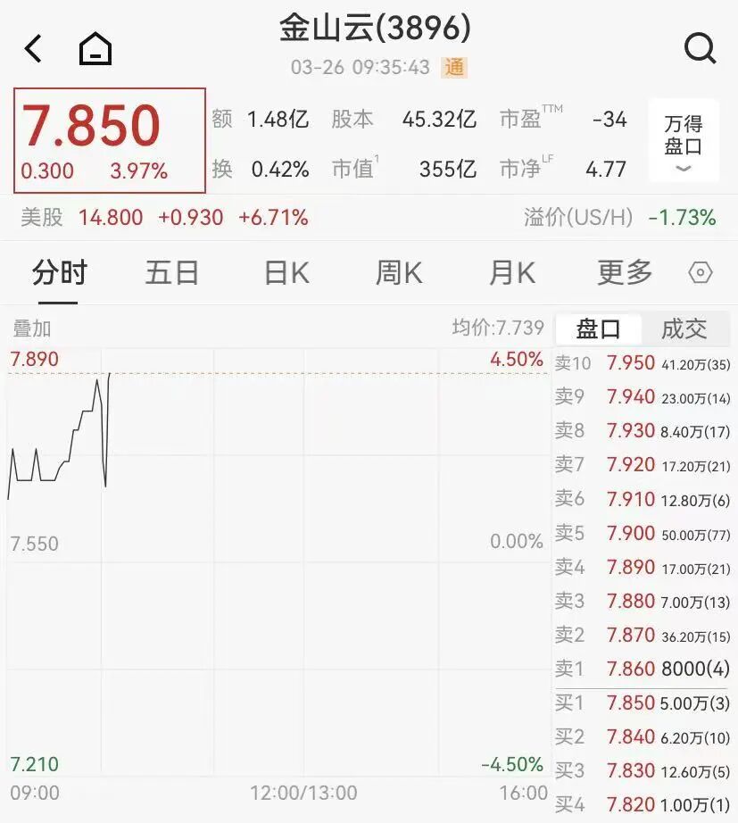 3月26日,金山云港股高开,截至9:35,涨幅拉升近4%;其美股股价昨夜收涨近7%。