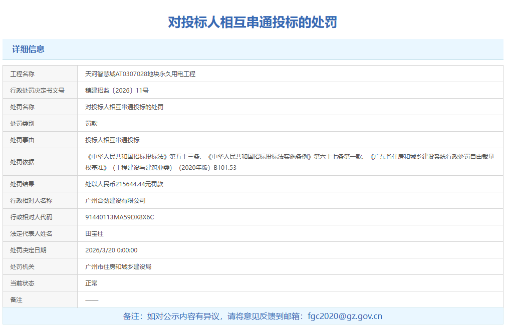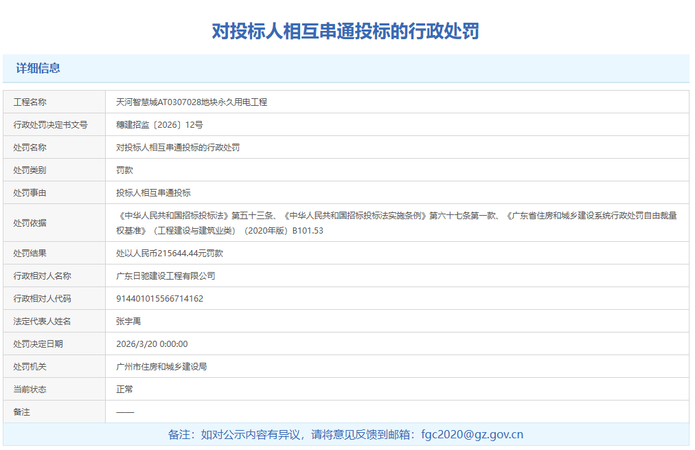 3月20日,广州市住房和城乡建设局通报两则《对投标人相互串通投标的行政处罚》。被通报的广东日驰建设工程有限公司、广州合劲建设有限公司均被处以人民币215644.44元罚款。