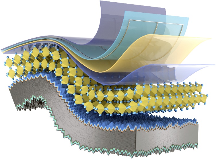 针对这一核心难题,隆基绿能李振国、徐希翔、何博团队联合苏州大学张晓宏、刘江教授团队,创新设计出“一紧一松”的双缓冲层结构。疏松层能像弹簧床垫一样吸收耗散应变能,缓解机械应力;致密层则确保高效的界面电荷提取与稳固连接。这种“刚柔并济”的纳米级分层设计,为柔性叠层电池披上“耐用铠甲”。