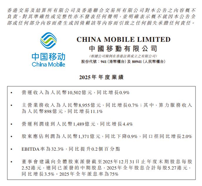 中国移动3月26日在港交所公告,2025年营运收入为人民币10502亿元,同比增长0.9%。主营业务收入为人民币8955亿元,同比增长0.7%。股东应占利润为人民币1371亿元,同比下降0.9%,同口径同比增长2.0%。董事会建议向全体股东派发截至2025年12月31日止年度末期股息每股2.52港元,连同已派发的中期股息,2025年全年股息合计每股5.27港元,同比增长3.5%。2025年全年派息率为75%。