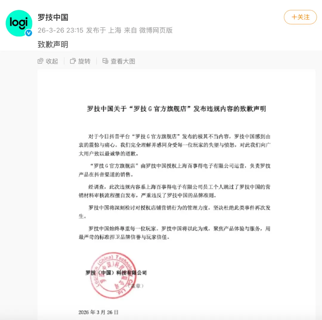 3月26日晚间,罗技中国发布声明,就“罗技G官方旗舰店”违规内容致歉。