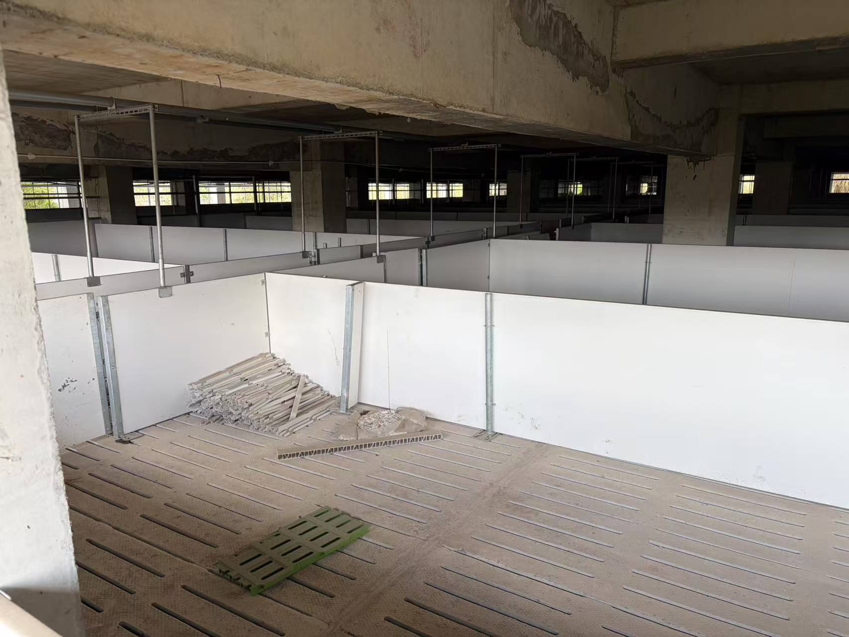 一楼可见完整养猪配套设施,但均闲置未启用。每层设有标准化猪舍,地面铺设漏缝地板;角落可见大型负压风机及配套管道,尚未完成安装调试;部分角落堆放成摞的棕色湿帘纸、绿色塑料配件等养殖耗材。