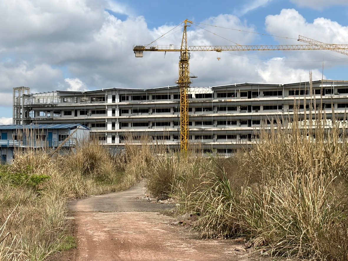 建筑主体为六层混凝土框架结构,目前尚未完成后续装修。外墙仅呈现水泥原色,各楼层窗户均为空洞框架;建筑顶部可见裸露金属钢架,尚未封顶。现场塔吊固定,无运转痕迹,吊臂静止,属长期停用状态。场地外围及通往主楼的道路两侧杂草覆盖,高秆芦苇、枯草等植被茂密,高度基本及腰。