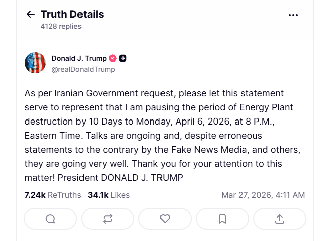 当天,特朗普在其社交媒体“真实社交”上发帖写道,“应伊朗政府请求,特此声明:我将把针对(伊朗)能源设施的打击再推迟10天,至美国东部时间2026年4月6日晚8点。”