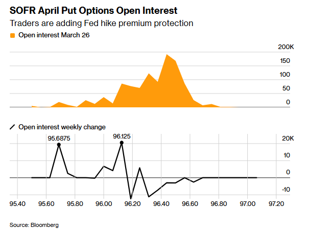 在追踪美联储政策的利率期权市场上,本周出现了针对有担保隔夜融资利率(SOFR)的相关押注需求,这些押注与美联储最快两周内“紧急加息”的预期相吻合。换言之,如果在4月29日美联储下次议息会议召开之前,债券市场显著上修对加息的预期,那么这些头寸将有望获利。