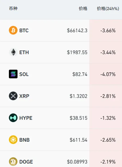 3月27日晚,比特币一度跳水跌破66000美元,截至28日7:36,比特币跌超3.6%,以太坊跌至1987美元跌超3%,SOL跌超4%,XRP、狗狗币等均下跌。