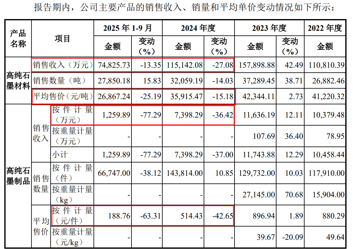 2024年和2025年前三季度,公司主要产品高纯石墨材料销售收入和平均售价持续下滑,收入从157,898.88万元降至74,825.73万元,售价从42,344.11元降至26,867.24元。