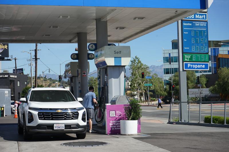 3月17日,顾客在美国加利福尼亚州洛杉矶市中心的一家加油站给车辆加油。新华社