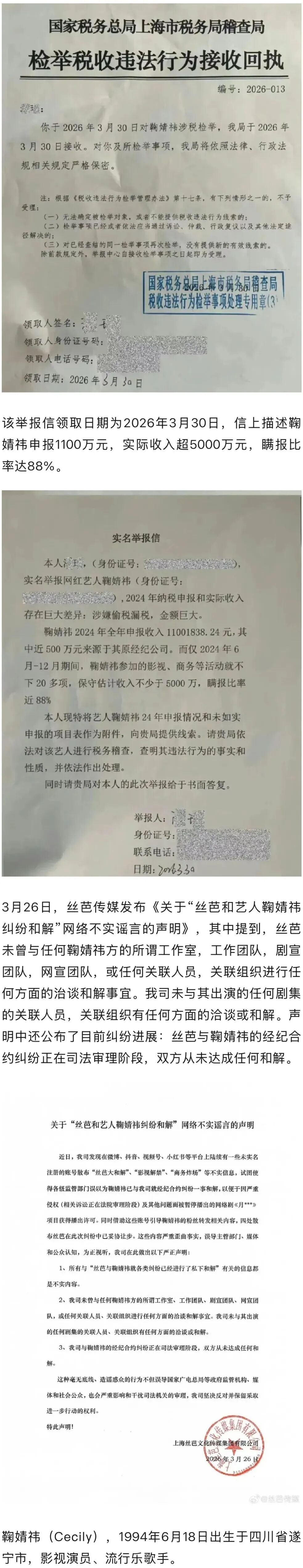 3月31日,一张丝芭传媒实名举报鞠婧祎的举报信登上热搜,合约纠纷持续升级,引爆舆论漩涡,双方矛盾已从合约效力争议蔓延至税务问题。